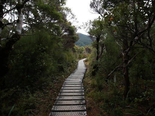 From rocky lookout, the track winds its way further up the hillside, eventually reaching a junction some 4.9km from the start of the track. The left fork descends to Totara Flats, while we continued up the other track. The track then crosses the aptly-named Pig Flat (aptly named for the flat part, couldn't comment on the pigs), meandering through stunted trees and over boardwalks, soon reaching Mountain House Shelter.